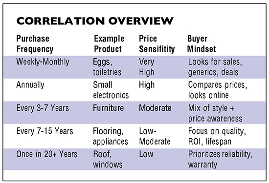 Unlike eggs, flooring for most people is an infrequent purchase of about ten years on average. This tends to diminish price sensitivity in the category. You may know what the price fluctuation of eggs is week to week, but recalling the price of the floor you purchased a decade ago can be difficult. Therefore, the tariff-driven price increase will be assuaged because of the inverse correlation of purchase frequency to price sensitivity.