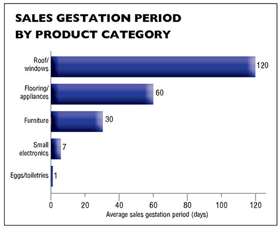 Flooring, as either part of a room makeover or as a re-flooring project by itself, can be a lengthy journey. Sixty days for a “high consideration” category like flooring will include planning and research, consultation and estimates and, finally, purchase. This excludes installation, since that cost totally depends on project size, product availability and scheduling. Room makeovers, such as a kitchen, will take 90 days or longer. In most cases, there is a considerable amount of time invested by the customer before the purchase is made, so the customer may be less likely to abandon the journey due to a tariff increase once fully committed at the consultation stage.