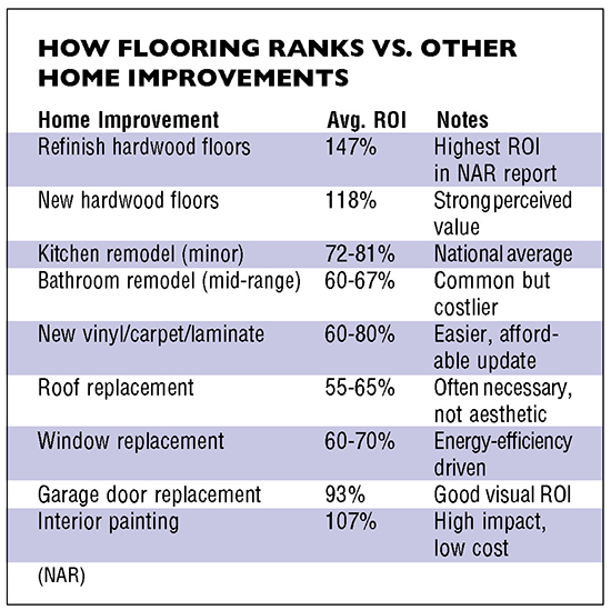 Regardless of tariff actions, flooring is likely to remain among the top three home improvement projects, according to a 2022 Houzz U.S. Renovation Study. And according to Statista and the Home Improvement Research Institute, flooring buyers skew higher in income and homeownership rate. Therefore, they can, and often will, afford what they need and want for their homes. In order to facilitate this, retailers should emphasize the investment value of new flooring over its lifespan and provide ways to make ownership even easier through financing options or deferred-payment plans. Hardwood flooring ranks highest in ROI for home improvement projects, according to the National Association of Realtors (NAR).